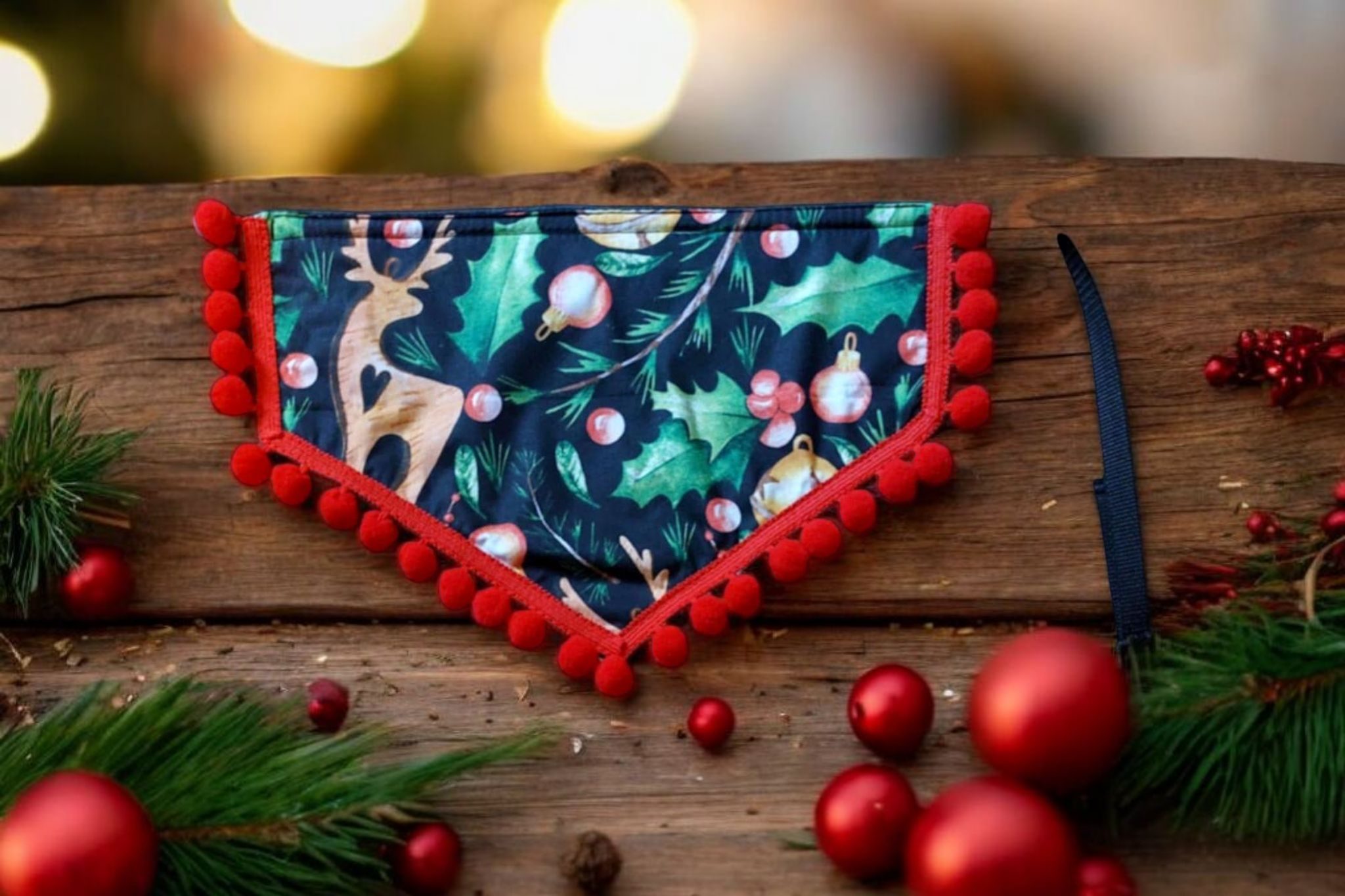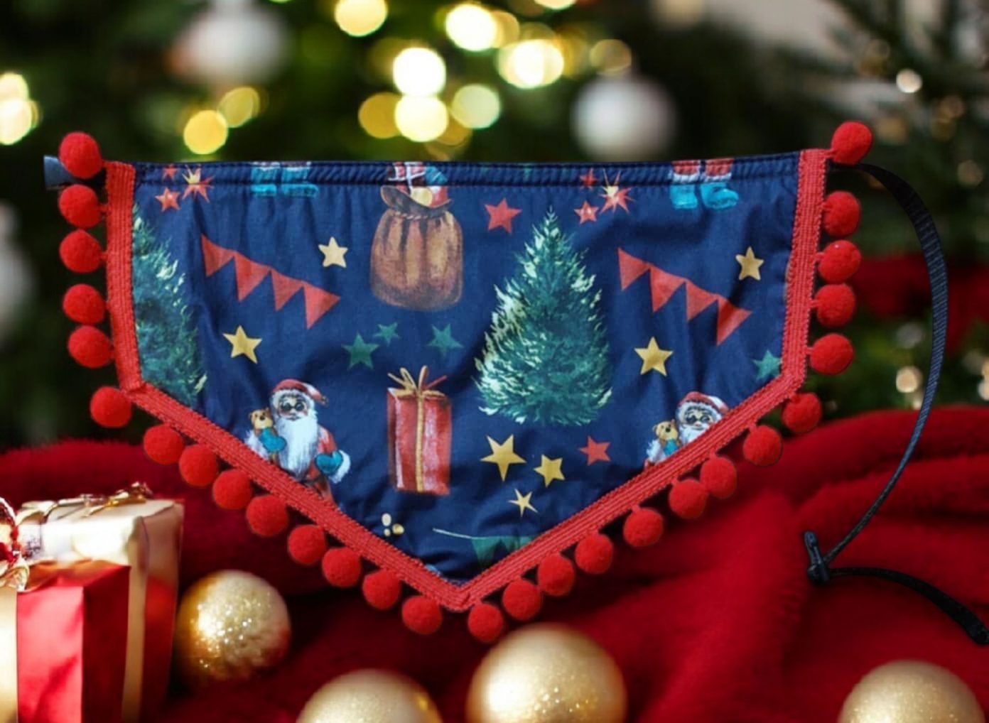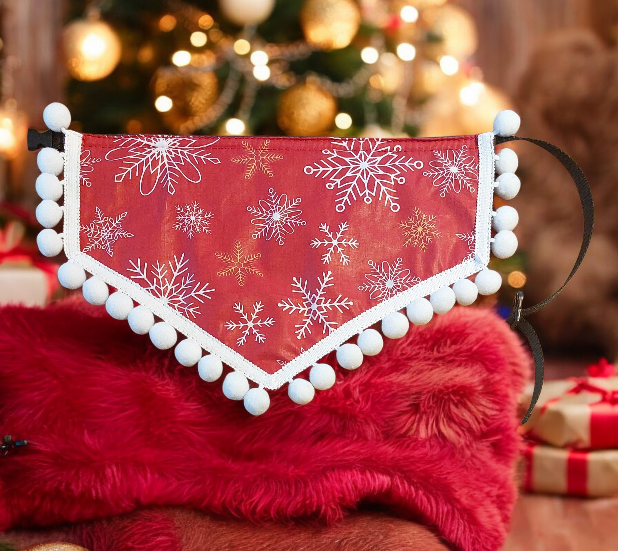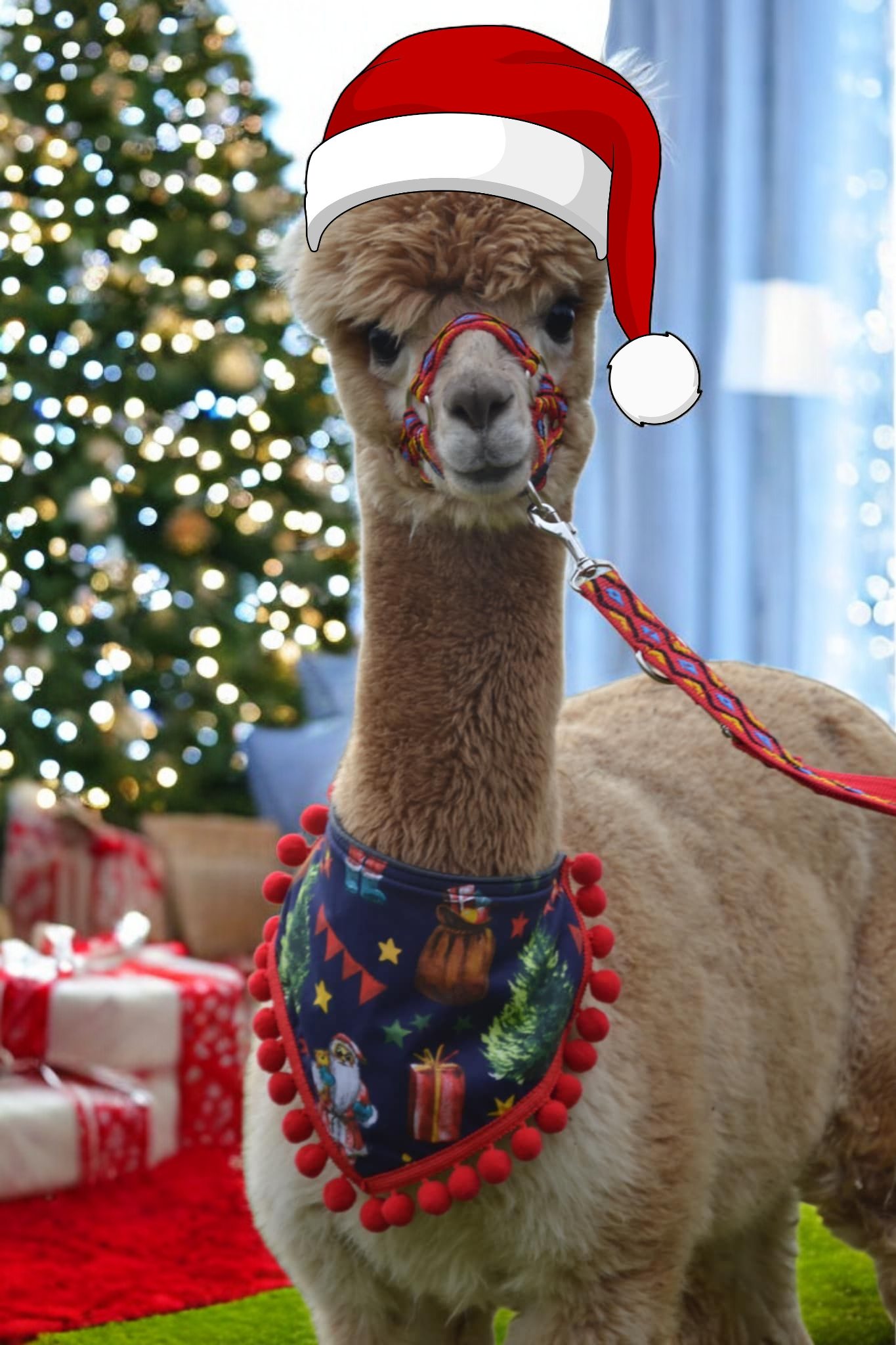 Kolorowa chusta świąteczna dla alpak. Praktyczna, zapinana na klamrę z możliwością regulacji. Dostępna w 4 wzorach. Łatwość zapięcia i regulacja stanowią priorytet od początku naszej pracy z alpakami i lamami. Chusty pięknie komponują się z naszymi innymi akcesoriami.