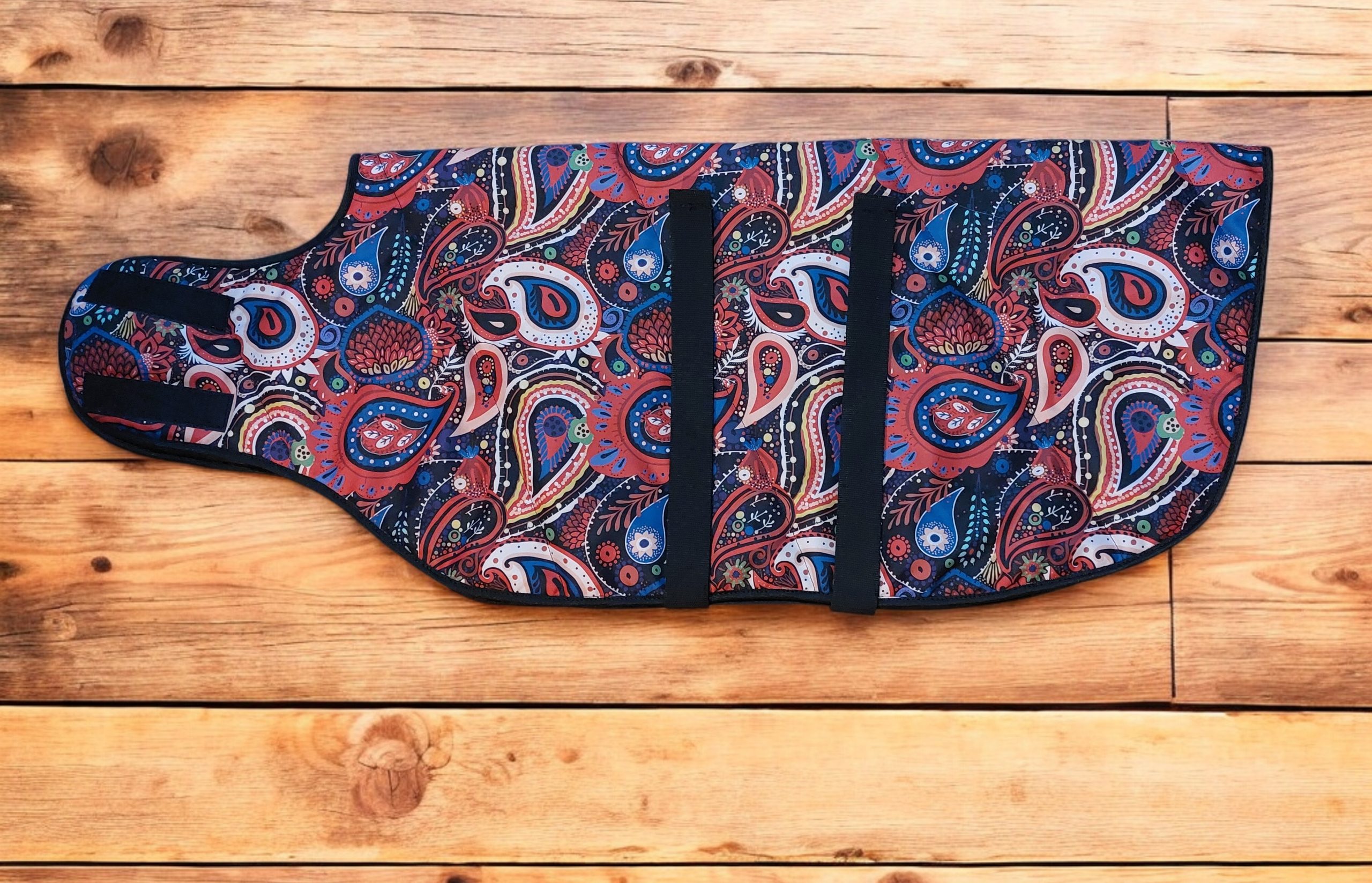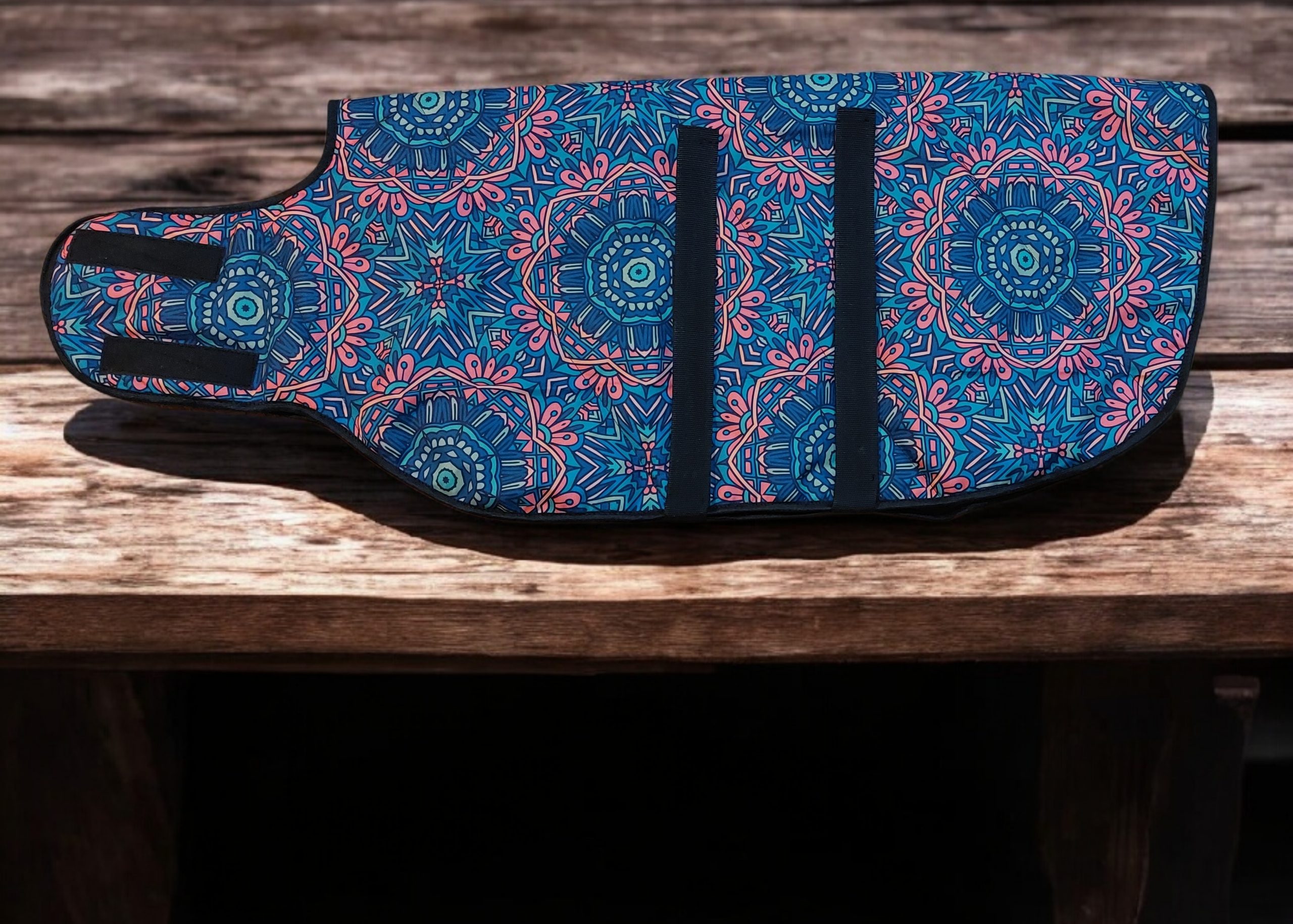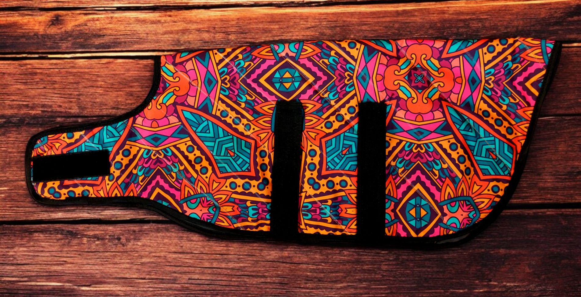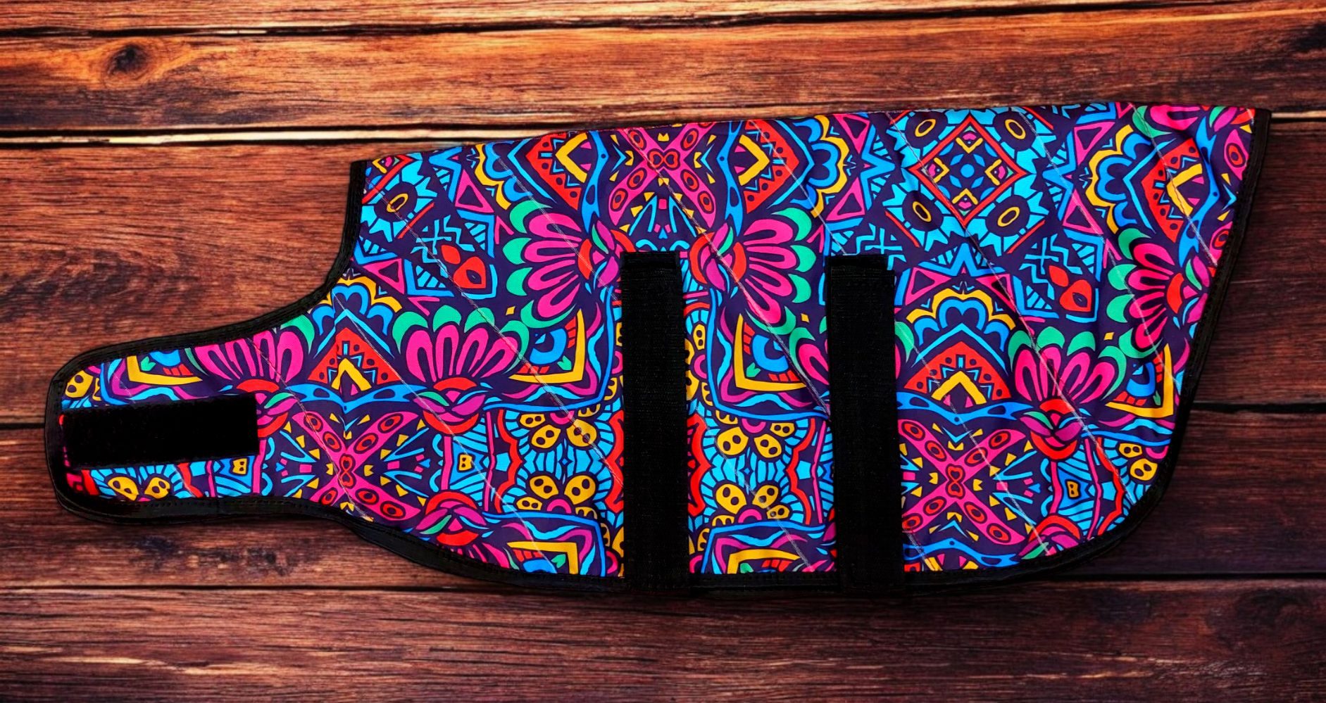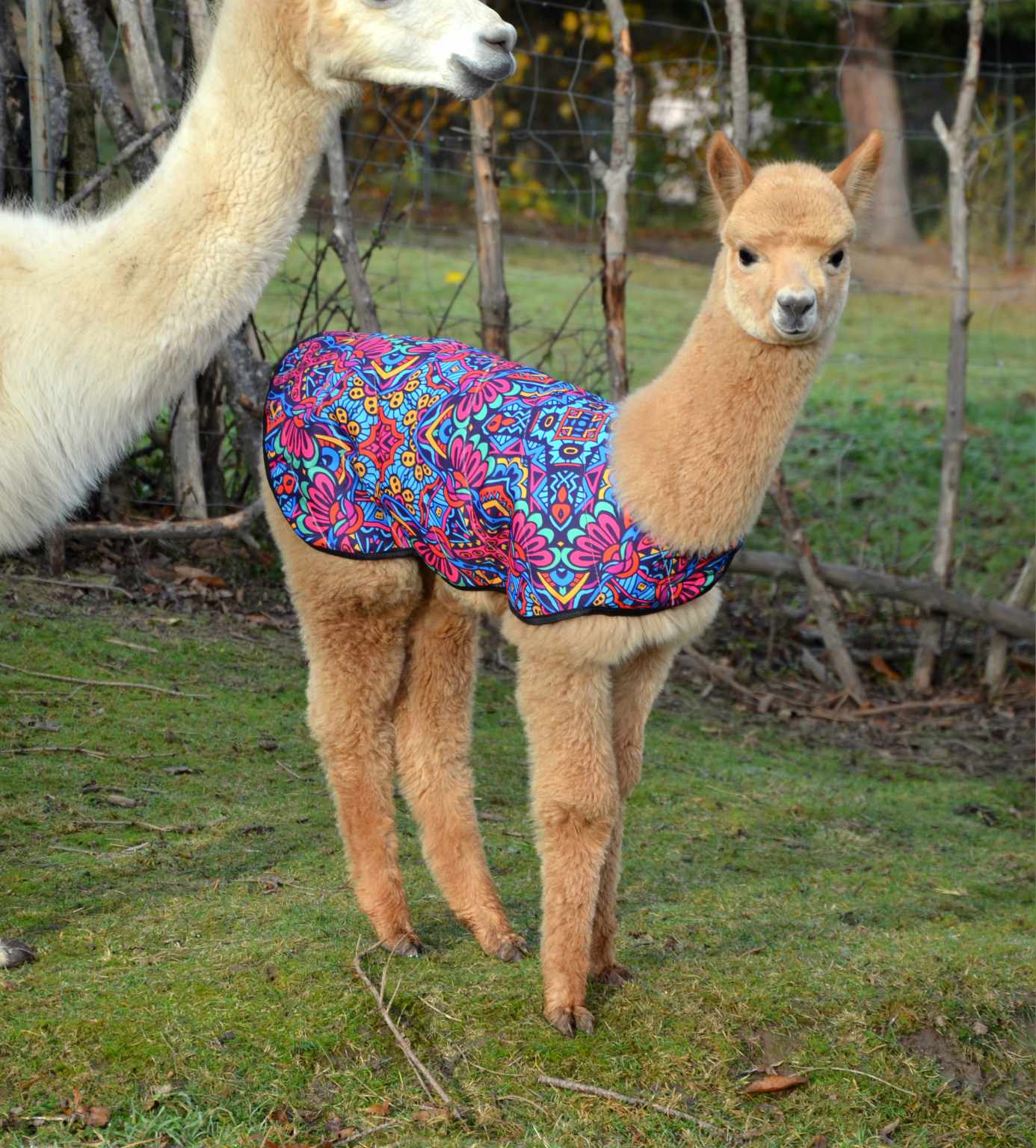Wzorzysty ocieplacz dla młodej alpaki w wieku od 2 do 5mc życia. Zabezpiecz swoje alpaki przed chłodami i wilgocią. Nasze ocieplacze wykonane są z zewnątrz z materiału nieprzemakalnego, od spodu ocieplone polarem. Zapinane na rzepy. Dostępne w kolorowe wzory: witraż i mandala oraz liście i kwiaty. Ocieplacze pięknie komponują się z naszymi innymi indiańskimi akcesoriami.